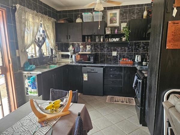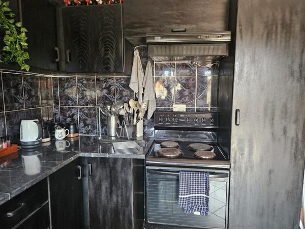 An open plan living area and stylish kitchen with beautiful black tiles, wooden cupboards and modern countertops