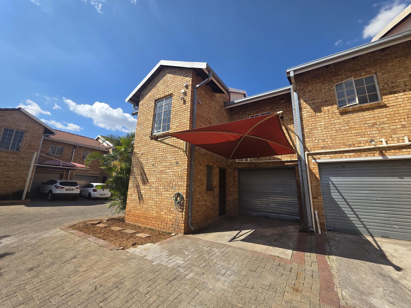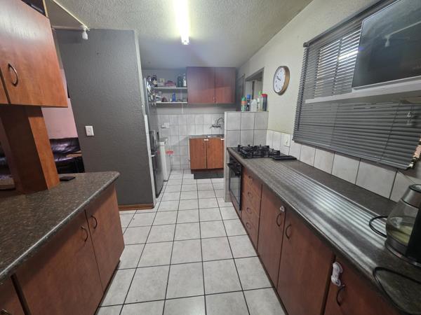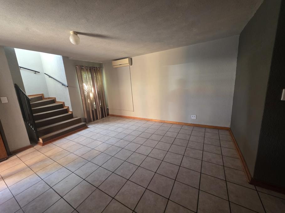 Three bedroom duplex townhouse in lower Bo-dorp Rustenburg, with an open plan kitchen and lounge on the ground floor, and a guest toilet, the top floor boasts three bedrooms and one full bathroom.