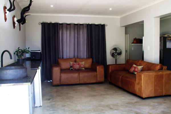 Built-in braai area overlooking a lush, green garden...