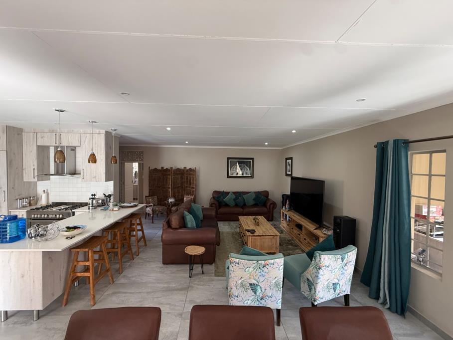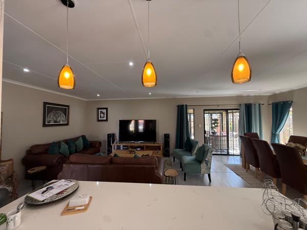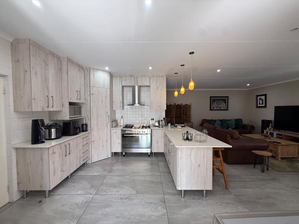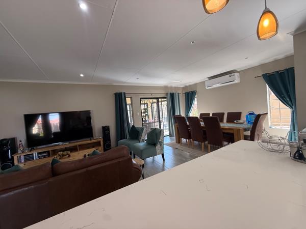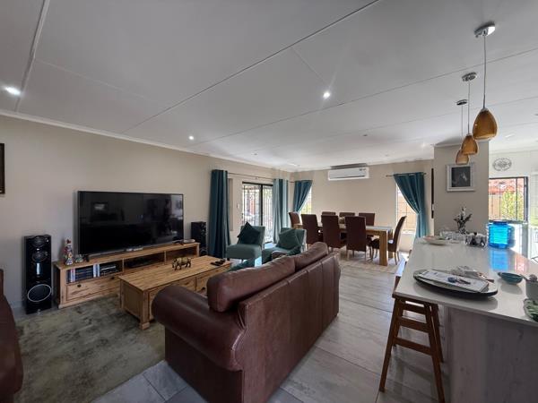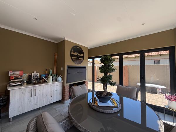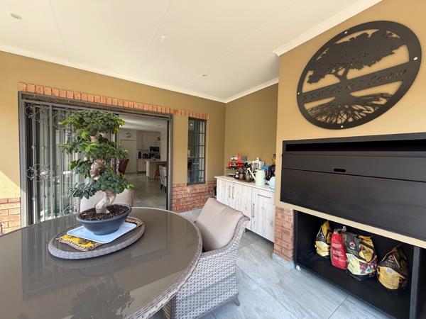 The heart of the home is a sophisticated kitchen fitted with a premium gas stove, seamlessly connecting to a spacious open-plan lounge and dining areaideal for both relaxed family time and entertaining guests. Natural light pours into the living space, which opens through elegant stacker doors onto a covered patio complete with a built-in braai, overlooking a sparkling splash pool.