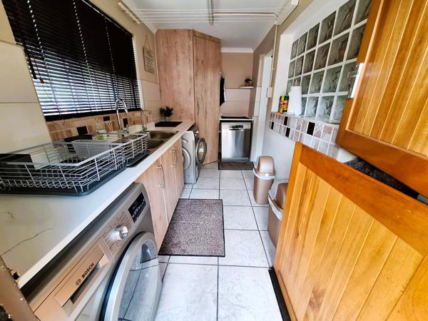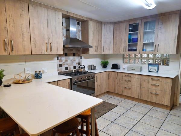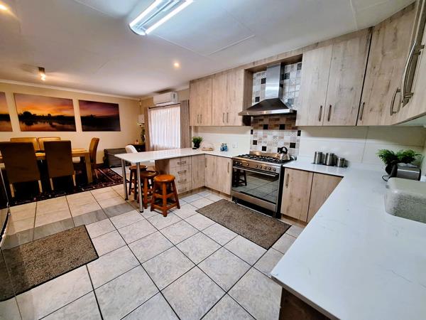 The modern open-plan kitchen is a must-see seriously, words dont do it justice!. Designed for both style and functionality, it features ample cupboard space, a quality gas stove, and a separate scullery laundry room for added convenience. The open layout extends into the dining area, creating a spacious and welcoming atmosphere.