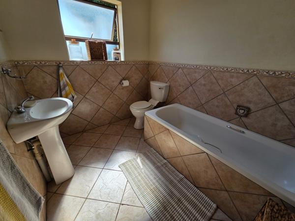 Inside, the main bedroom has an en-suite bathroom with both a bath and shower. Additional bedrooms are well-sized, with another bathroom also fitted with a bath and shower. The kitchen is tiled and practical, flowing into comfortable living and dining areas.