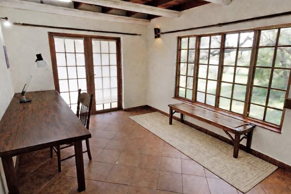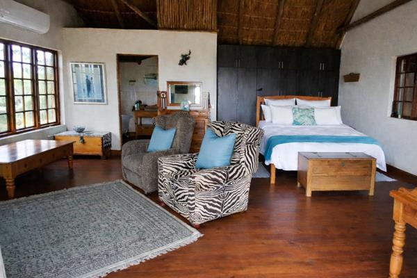 Tiled flooring throughout exception of main bedroom which has wooden floors with beautiful stained-glass windows. Open ceilings except in the main bedroom. Start your mornings with coffee on the patio while watching game roam freely. End your days with sundowners and a braai under an incredible canopy of stars.