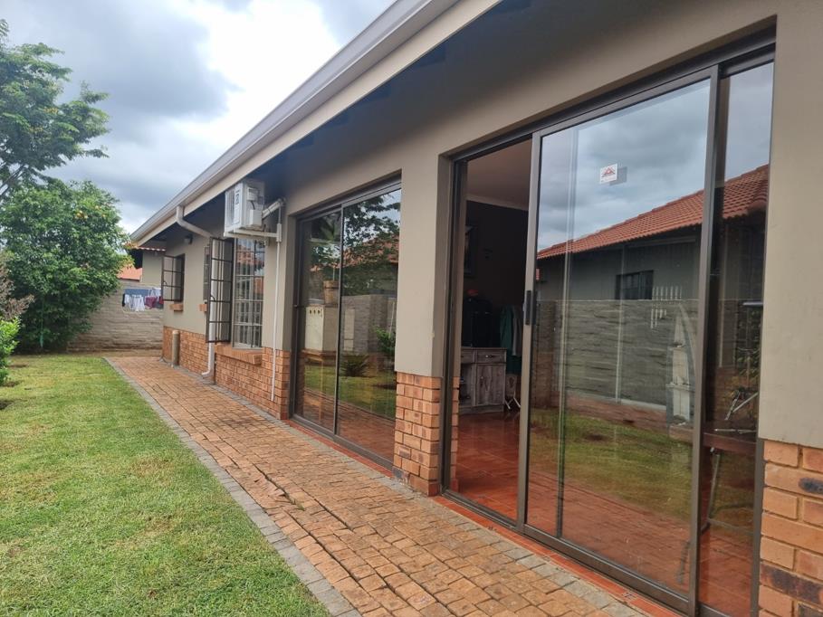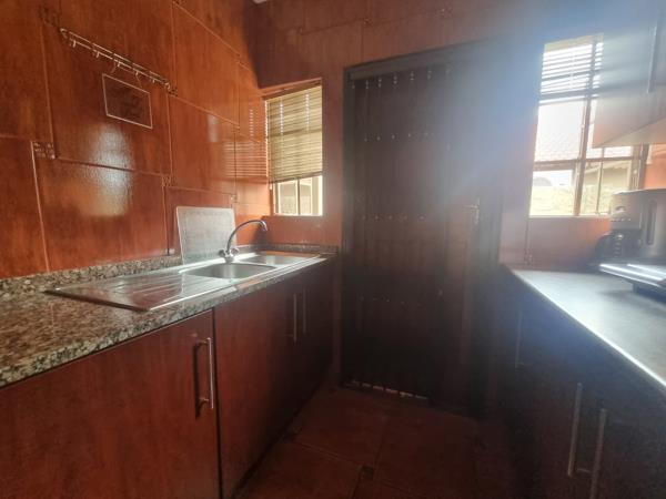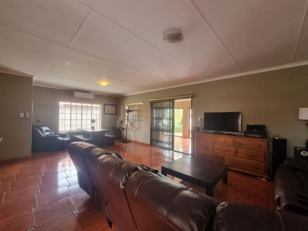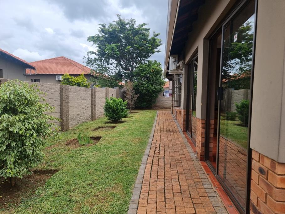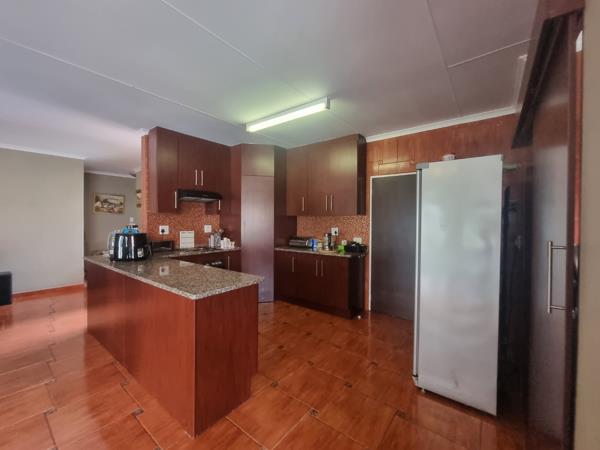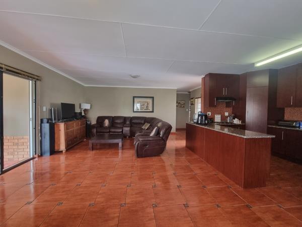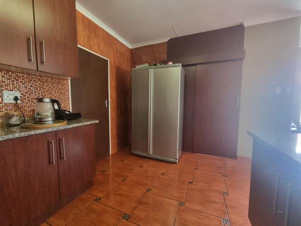 This distinguished four-bedroom, two-bathroom residence offers an exemplary standard of comfortable living within a highly secure estate in Waterkloof AH, Rustenburg. Designed for contemporary lifestyles, the property presents a harmonious blend of sophisticated design and practical functionality. The interior features a spacious open-plan layout, seamlessly integrating living, dining, and kitchen areas. The gourmet kitchen is meticulously appointed with extensive dark wood cabinetry, elegant granite countertops, and a dedicated scullery. Durable tiled flooring extends throughout these principal reception areas, complemented by expansive sliding glass doors that invite abundant natural light and facilitate effortless exterior access. A dedicated laundry area further enhances practicality.