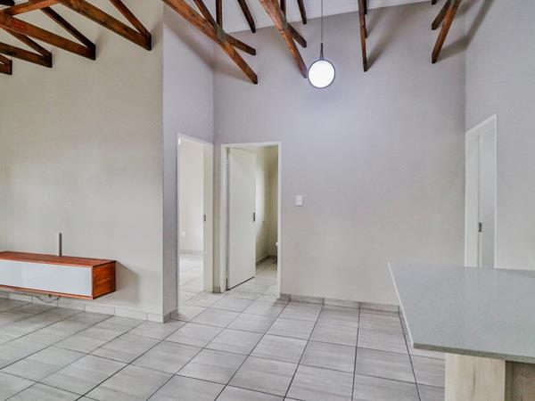 Offering 2 spacious bedrooms and 2 bathrooms main en-suite, an open-plan living area, and a stylish modern kitchen with granite countertops. High-volume ceilings with exposed trusses and aluminium window frames add a clean, contemporary feel.