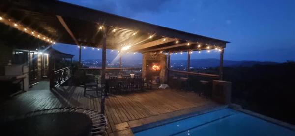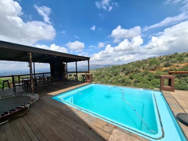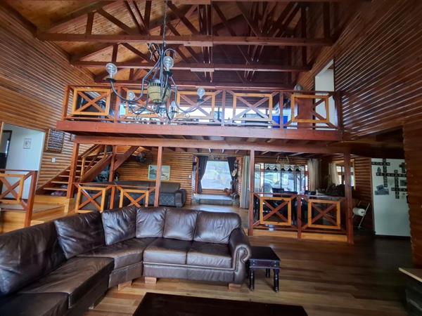 Eagles view atop Waterfall surroundings. Five bed wood log entertainer rising high on a 25 000 sqm plot.