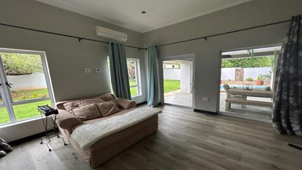 Stacker doors open onto a lush, well-maintained garden and sparkling swimming pool. The garden is fully irrigated for easy upkeep.