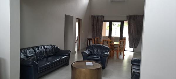 A covered patio area with a built-in braai provides the perfect space for relaxing or entertaining guests while enjoying the outdoor surroundings.