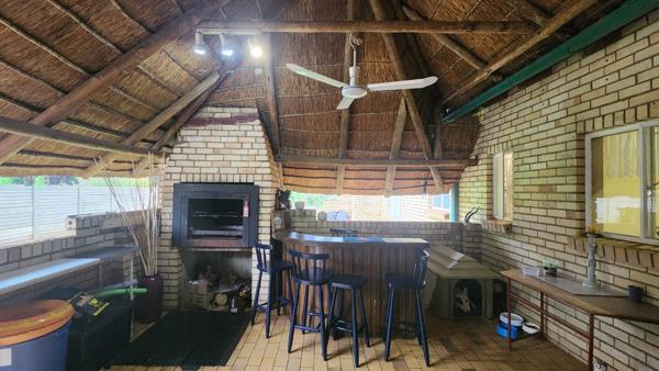 The property is equipped with a 5 kVA inverter system with batteries, ensuring uninterrupted power supply during load shedding. Extras include a beautiful garden with a swimming pool, two lapas with a built-in braai, a double garage, double carport, solar lights, CCTV, electric gate, and electric fencing.