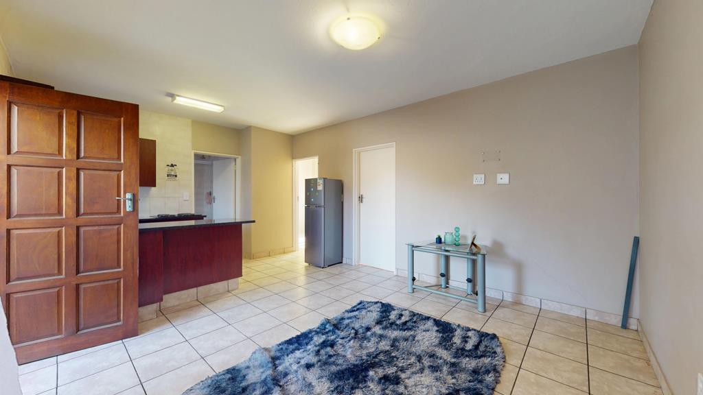 The apartment features an open-plan living area with stylish granite kitchen countertops, tiled flooring, and built-in wardrobes. Safety is a priority with full perimeter walls, electric fencing, a security gate, and CCTV surveillance.