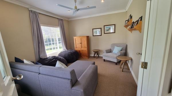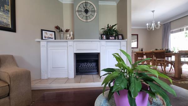 Enjoy a spacious TV room with DSTV, LAN cable, and a ceiling fan. The lounge offers a cozy ambiance with a gas fireplace. An additional room with a built-in bookshelf is perfect for a study or music room, it features large doors opening up to a courtyard.