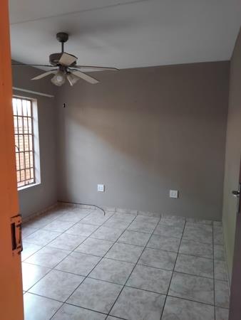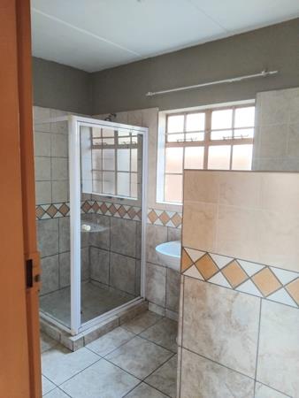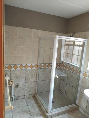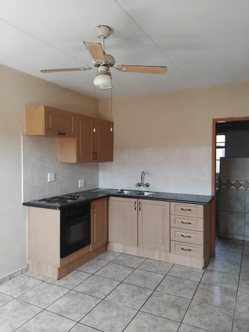 Kitchen with built-in cupboards, living area with ceiling fan, 2 bedrooms one with ceiling fan, and bathroom with a shower and space for a washing machine.