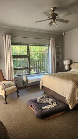 The spacious, air-conditioned master bedroom offers built-in cupboards, an ensuite bathroom, and direct access to a well-maintained garden with an outdoor braai area.