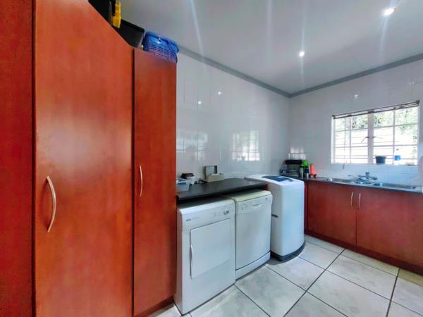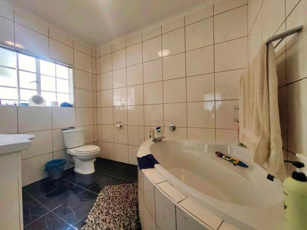Main house features 4 bedrooms, 2 bathrooms, study, open plan lounge and dining room, kitchen with a separate scullery. For entertainment there is a large covered Lapa with built-in braai, swimming pool and a well maintained garden. Two garages, 2 carports and space for a caravan and trailer. Alarm system.