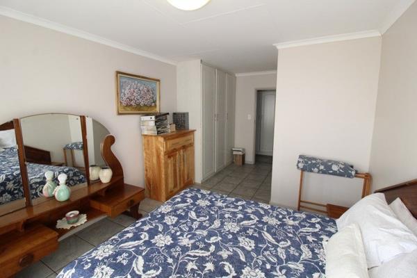 Outside, a lovely patio with a built-in braai overlooks a large swimming pool, making it perfect for entertaining guests or relaxing in the sun.