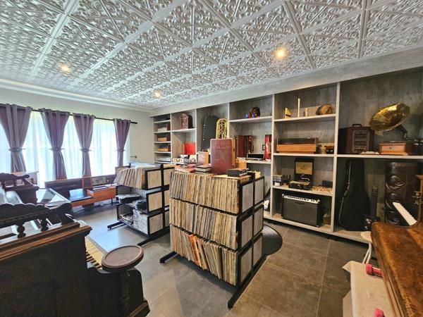 An entertainment room with sliding doors opens to a covered patio and built-in braai, perfect for hosting friends or enjoying relaxed weekends at home.