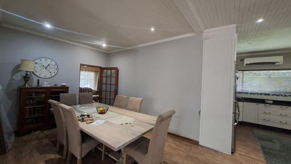 The home features three spacious bedrooms, two full bathrooms, and a guest toilet. The main bedroom is a private retreat, complete with ample built-in cupboards, a beautiful en-suite bathroom, and a door that opens directly onto the swimming pool, creating a peaceful indoor-outdoor flow. Air conditioning in one bedroom, the TV room, and the kitchen ensures year-round comfort, while a security gate in the passage adds an extra layer of safety.