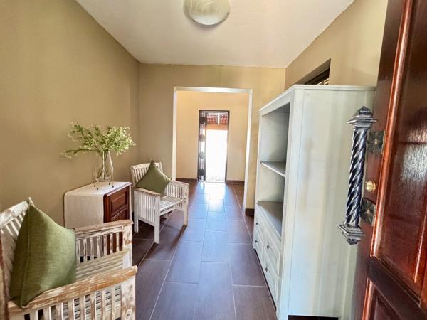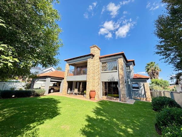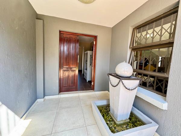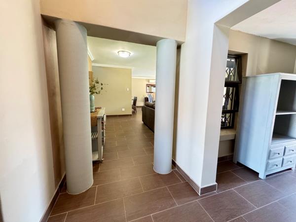 The outdoor area is built for entertaining, with a covered patio, built-in braai, and a sparkling swimming pool surrounded by a well-maintained garden. A double garage, extra carports, and top security add to the homes convenience and peace of mind.