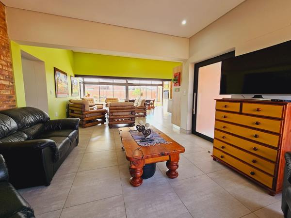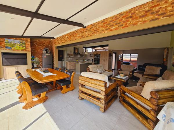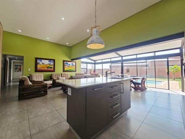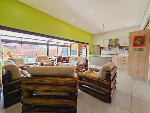 The home is north-facing, allowing natural sunlight to stream into every corner and creating bright, inviting spaces throughout the day. The thoughtfully designed open-plan layout seamlessly connects a formal lounge, TV lounge, dining room, and indoor braai area, offering both comfort and versatility for entertaining.