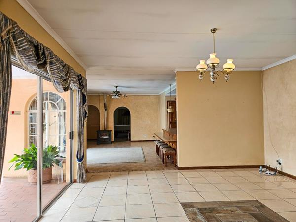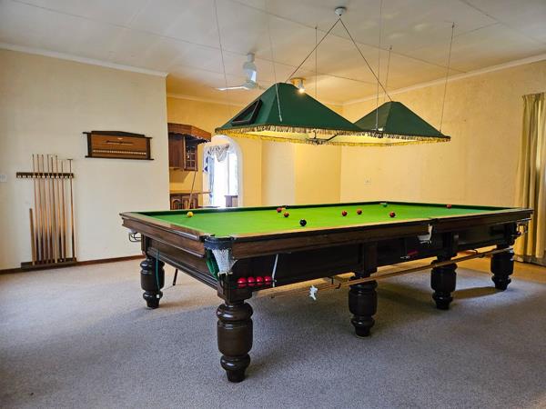 The patio overlooks a shimmering blue pool, offering a tranquil backdrop for summer gatherings, weekend braais, or relaxed afternoons with the family. A standout feature of the home is the spacious entertainment room, complete with a full-size pool tableideal for game nights, celebrations, and quality time with loved ones.
