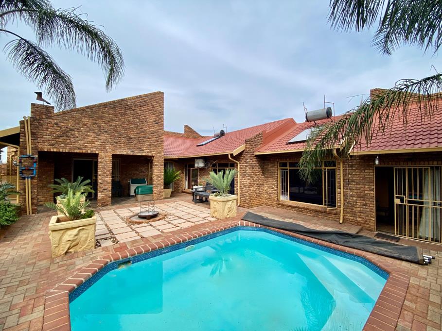 There is an undercover patio with built in braai overlooking a well manicured garden and a sparkling blue pool.