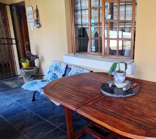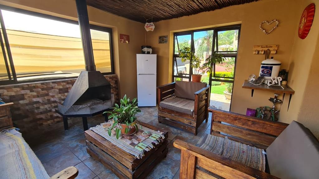 The entrance hall leads to an enclosed patio, featuring a built-in braai and fireplace perfect for family gatherings and opens out to a small deck.