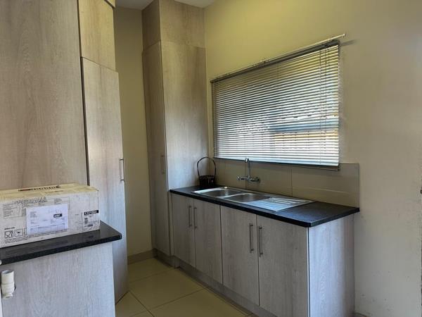 The ground floor welcomes you with a spacious open- plan lounge and kitchen, designed for seamless living. The kitchen features sleek modern finishes, ample cupboards space, and a separate scullery for added functionality.