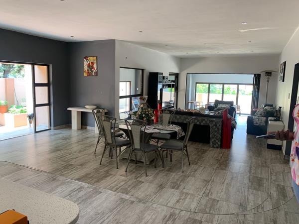 The home boasts a modern open-plan design that seamlessly connects the kitchen, dining area, and lounge, creating an inviting and functional space for family living and entertaining.