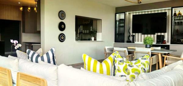 The home features two spacious lounges, a dedicated cinema room, and a patio dining area with a built-in gas braai. Stacker doors open seamlessly onto the pool area, creating the perfect indoor-outdoor flow for entertaining while enjoying panoramic views. A charming boma further enhances the outdoor experience, ideal for evenings around the fire.