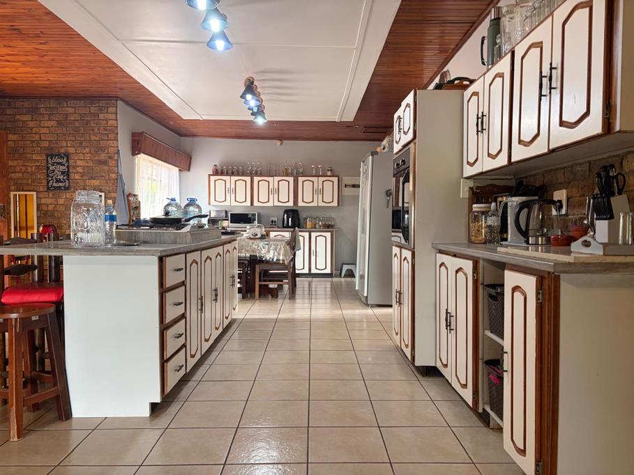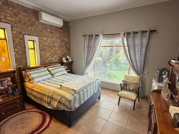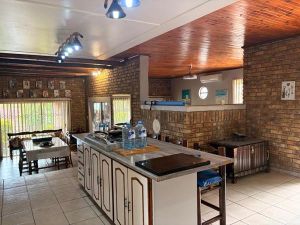The home features a very large kitchen fitted with a gas stove and ample cupboard space, complemented by a separate scullery for added functionality. The dining room flows seamlessly into a comfortable living room, which is also air-conditioned and opens onto a spacious lapa. The lapa is ideal for entertaining and includes both a built-in braai and a gas braai.