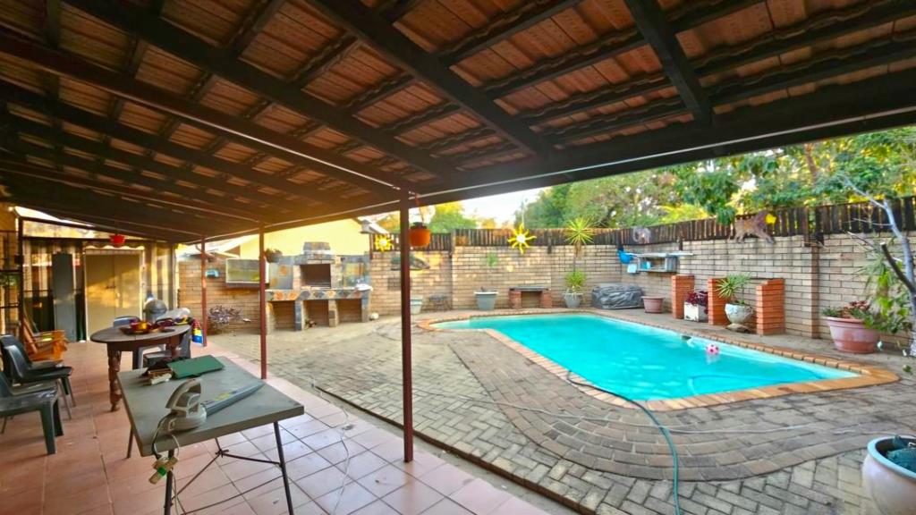 The main house features living areas, including a kitchen, dining room, and living room, along with a bathroom and separate toilet. Additional highlights include a large veranda, outdoor braai area, entertainment bar with toilet facilities, and a swimming pool, perfect for relaxed family living and entertaining.