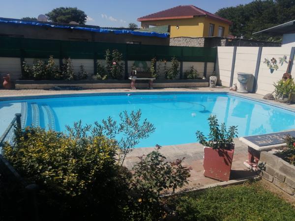 Outside there is a brand new sparkling pool with 3 jet jacuzzi nestled in a lovely garden. Lots of fruit trees and even a hot house tunnel with water supply. Strong borehole with 5000l water tank supplies main house, flatlets and outside taps with water.