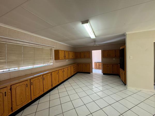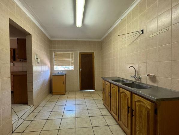 The entrance hall and reception area lead you to a study with fitted cupboards and a generous lounge. The open floor plan allows for flexible use as a dining area and second lounge. The kitchen is well-equipped with plenty of cupboard space and includes a laundry/scullery.