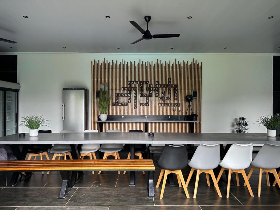Indoor-Outdoor Flow: Big aluminum windows and stacker doors bring in natural light, with Trellidor security on all doors.