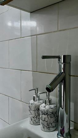 Bathroom: Modern layout featuring a basin, shower, and toiletfully tiled for easy maintenance .