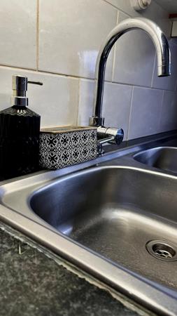 Living space: Shared tile flooring and curtain rails, seamlessly blending living and kitchen areas .