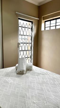 Bedroom: Cozy main area with tiled flooring, built-in cupboards, and curtain railsdesigned for maximum functionality .