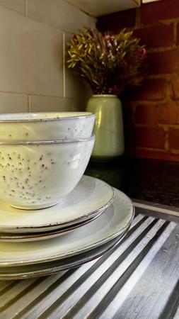 Kitchen: Wood-finished units, tiled floorspractical and stylish .
