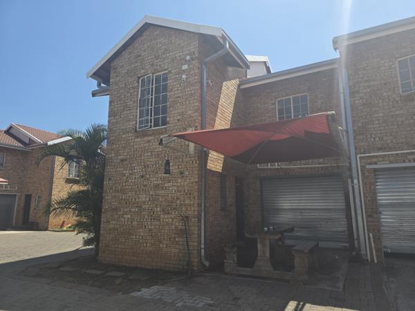 Three bedroom duplex townhouse in lower Bo-dorp Rustenburg, with an open plan kitchen and lounge on the ground floor, and a guest toilet, the top floor boasts three bedrooms and one full bathroom.
