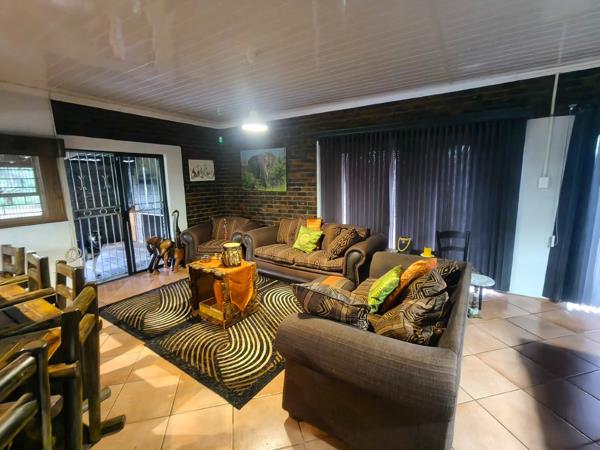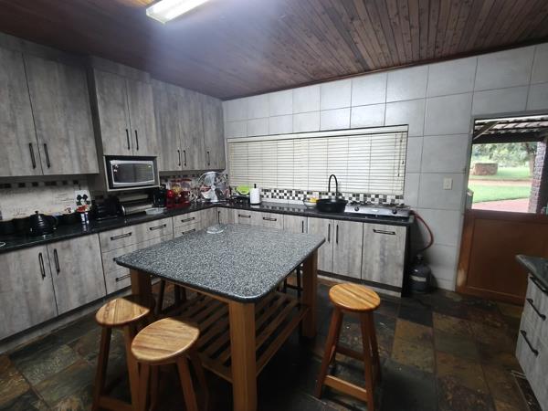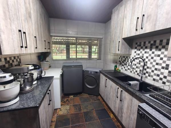 Enjoy the outdoors with a beautiful, low-maintenance garden, fruit trees, swimming pool, thatched Lapa with built-in braai, and separate boma area. Water is plentiful with 2 strong boreholes (12,000 & 6,000 L/h), 3 x 5000L tanks on a 9m stand, and solar (16KVA) with Eskom backup. Additional features include electric fencing around the main home, 3 garages, carports for 4 cars, ROM system in kitchen, and 5 staff units with water.