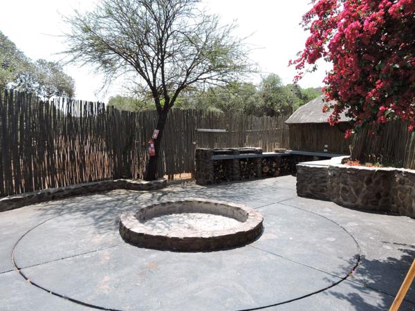 Pool with chairs and tables all around. Also, a deck area where one can go have a picnic and wait for the game to come drink from the natural ground dam.