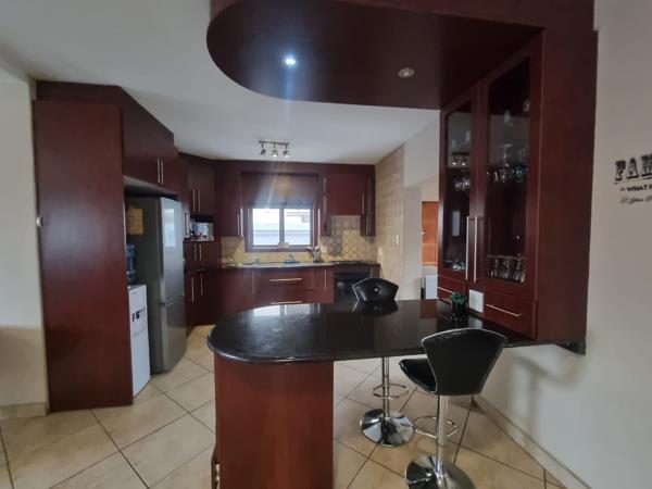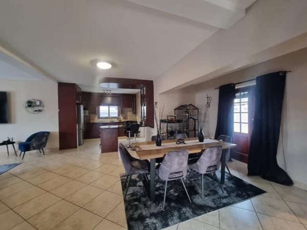Step inside to an open-plan layout that seamlessly connects the spacious living areas, dining room, and kitchen. The interior features durable tiled flooring throughout, providing a practical and contemporary foundation. The kitchen is well-appointed with dark wood cabinetry, granite countertops, a breakfast bar, and an integrated display cabinet, catering to both functionality and style. A dedicated scullery and laundry area further enhance convenience.