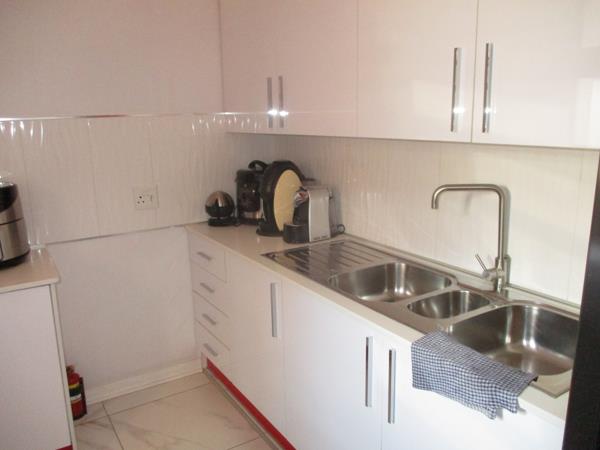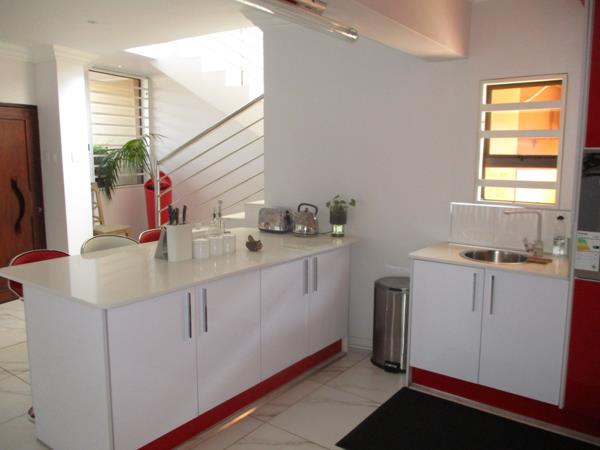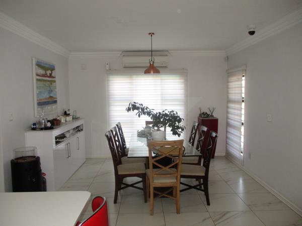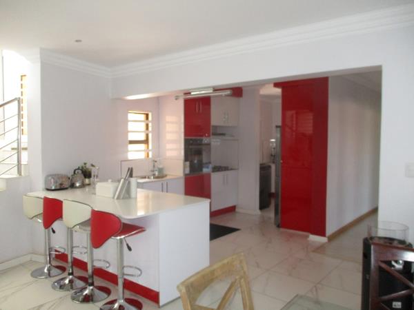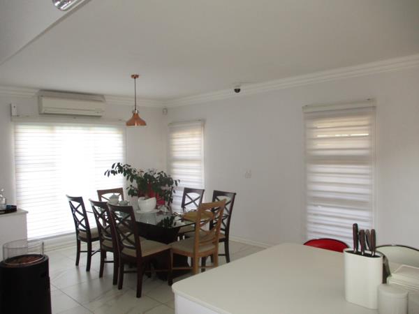 The modern space flows effortless into a spacious lounge where large sliding doors open out to a covered patio and beautiful pool area where you can host a summer braai or enjoying a quiet morning coffee