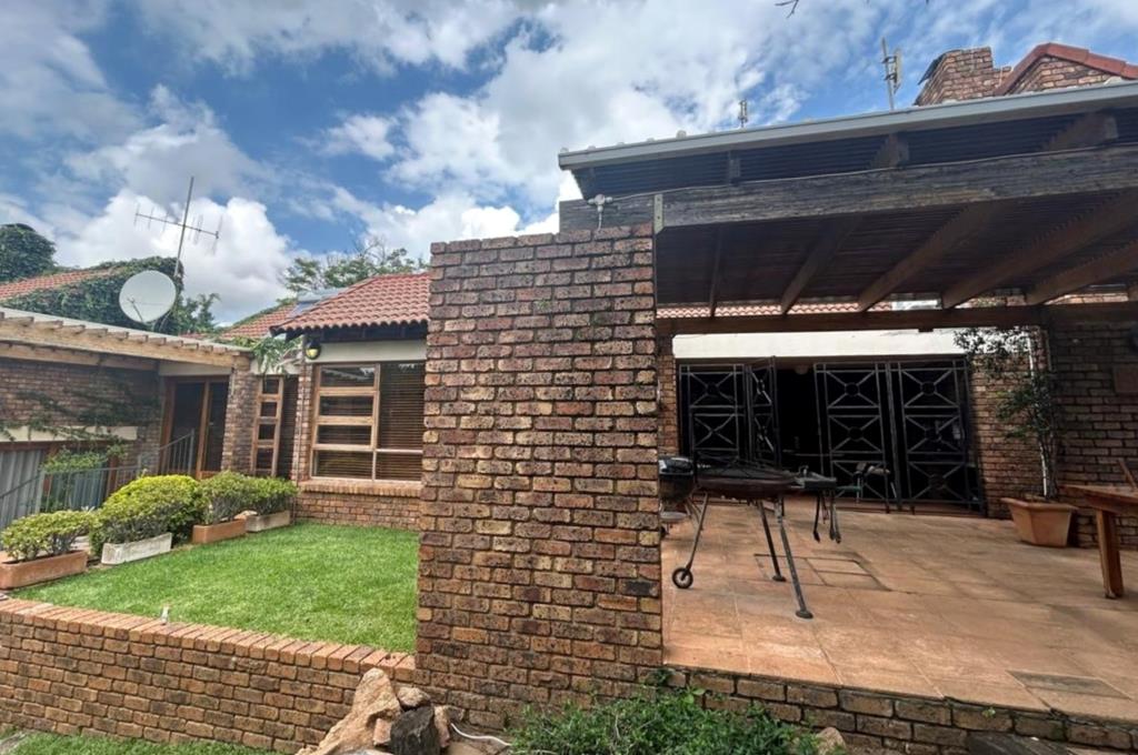 An enclosed patio with a built-in braai extends the living space outdoors, overlooking a sparkling swimming pool and a beautifully maintained garden perfect for hosting guests or enjoying peaceful afternoons at home.