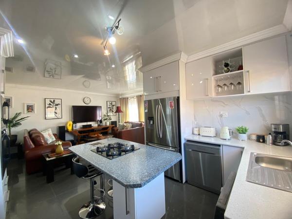 A beautiful, modern kitchen with ample storage space which flows into the living area, perfect to accommodate both your family members and friends.