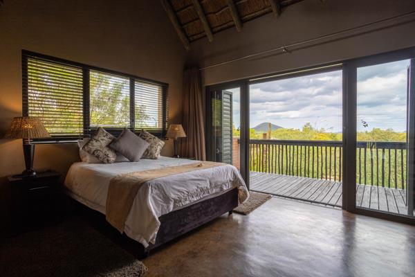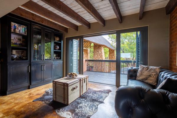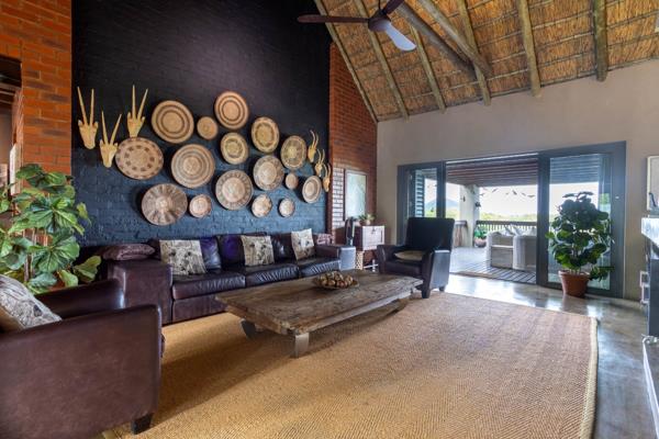 The home has an imposing entrance with wrap-around patios. As you step into this well appointed entrance hall, your eyes immediately stare into the vast double volume thatch roof space. The walls and stone clad fireplaces, add an air of under stated elegance, a sense of sophistication and luxurious bush living. The main areas of the home are open plan with a 12 seater dining room table in the centre of this earthy space and adjacent, a modern kitchen with all the state of the art appliances that will make cooking and baking a form of entertainment, allowing family and guests to mingle in the heart of the home. A TV Lounge and a more private, plush mini bar area, completes the upstairs entertainment area.