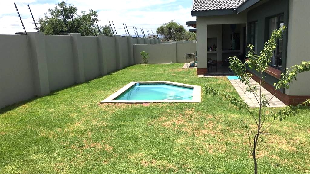 A striking design element is the high ceilings adorned with dark wooden beams, creating a sense of height and unique warmth. Step through the glass sliding door from the living area onto the stoep, where youll find a built-in braai, a small garden, and a delightful splash pool.