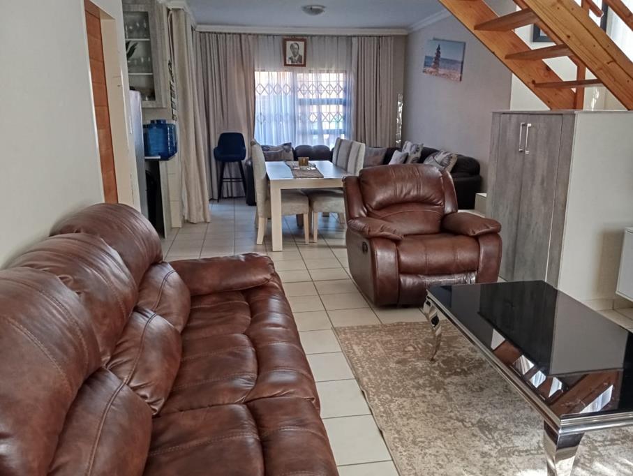 This home boasts three spacious bedrooms, two full bathrooms upstairs and downstairs you will find a living area with a dining room area and an open plan kitchen. There is garage with a carport and a visitors parking in the front area, and your petite patio with braai area in your back yard.