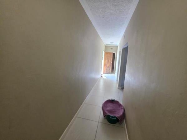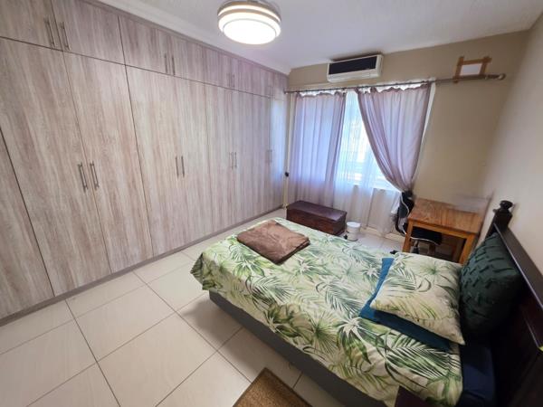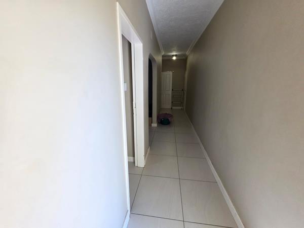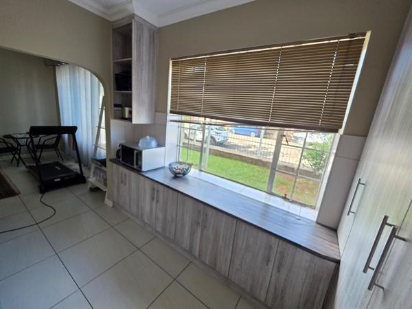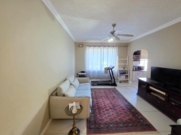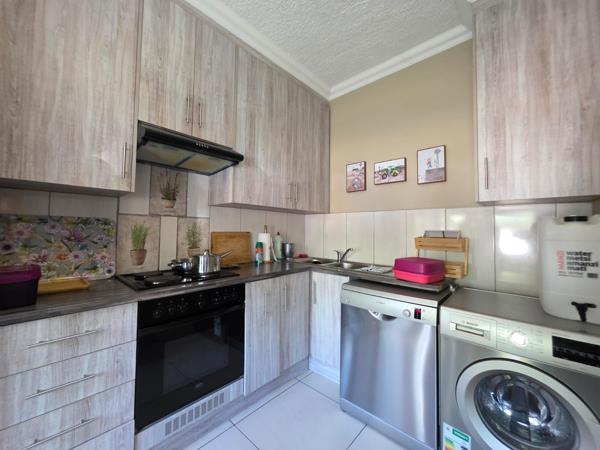 Features an open-plan lounge and dining room. The kitchen includes built-in cupboards, a stove, extractor fan, and blinds. Double carport provided. The block of flats is fully fenced for added security.