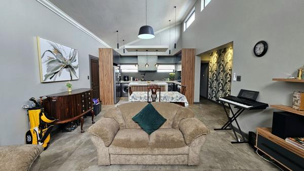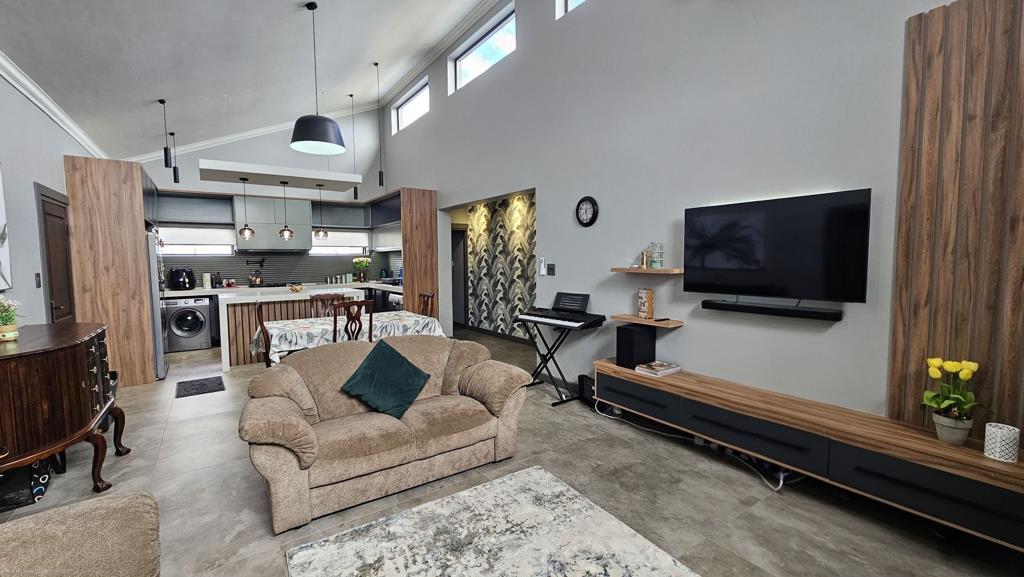The interior welcomes you into a bright and airy living area, enhanced by air conditioning to ensure year-round comfort. The space flows effortlessly to a dedicated braai area, creating an inviting setting for relaxed entertaining. The contemporary kitchen is thoughtfully appointed with ample preparation space, a gas stove, and extractor fan perfectly suited to everyday cooking and effortless hosting.
